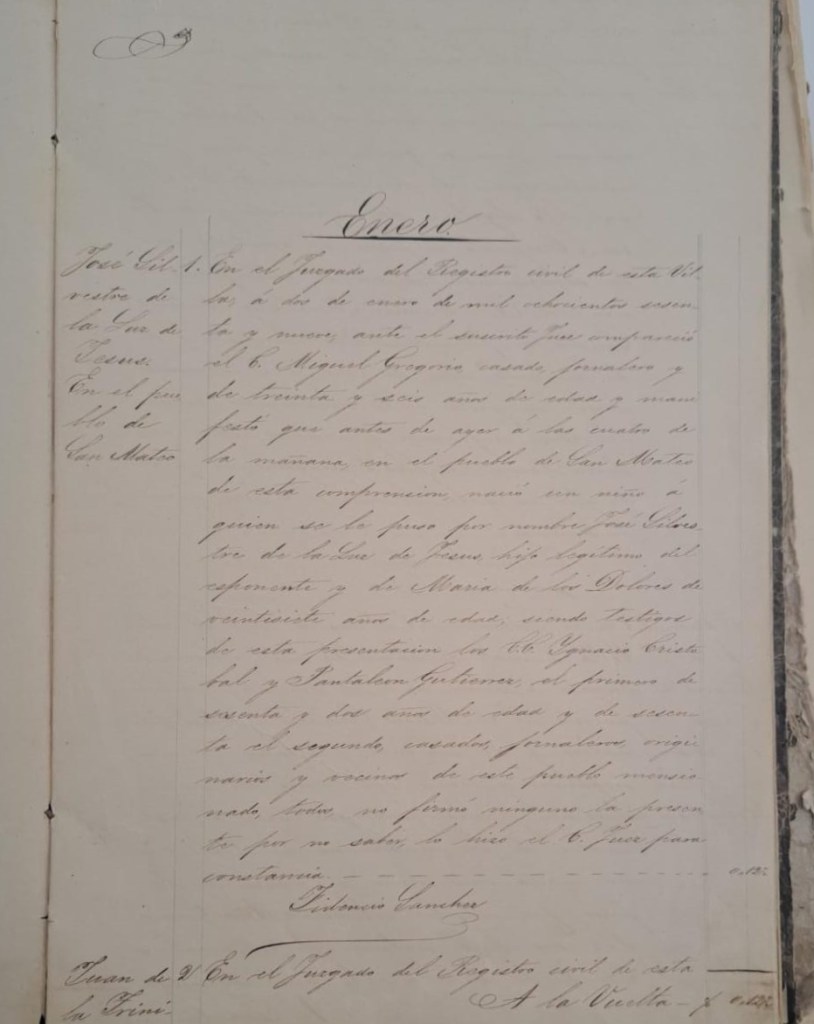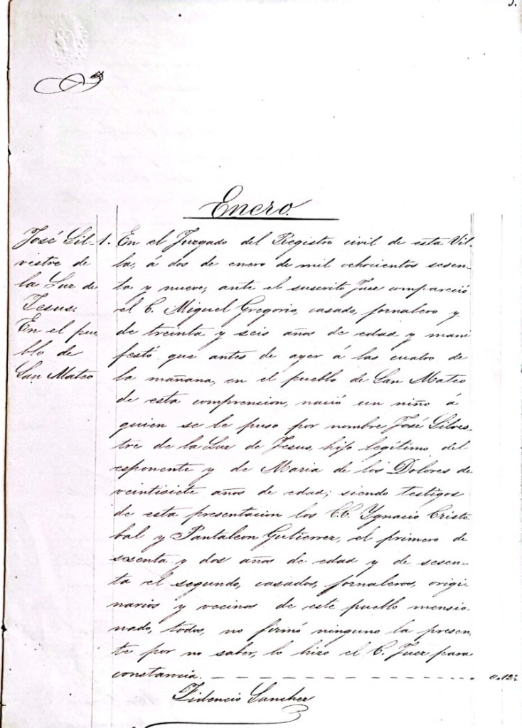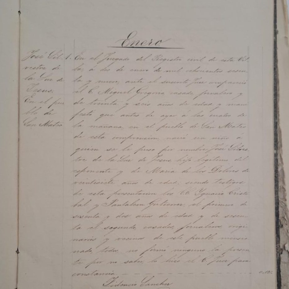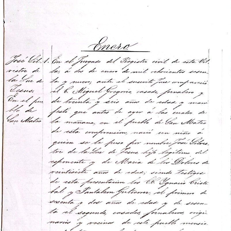 «En el Juzgado del Registro Civil de esta Villa, a dos de enero de mil ochocientos sesenta y nueve, ante el suscrito Juez compareció el C. Miguel Gregorio, casado, jornalero y de treinta y seis años de edad y manifestó que antes de ayer a las cuatro de la mañana, en el pueblo de San Mateo de esta comprención (sic), nació un niño a quien le puso por nombre José Silvestre de la Luz de Jesús, hijo legítimo del esponente (sic) y de María de los Dolores de veintisiete años de edad, siendo testigo de esta presentación los C.C. Ignacio Cristobal y Pantaleon Gutierrez, el primero de sesenta y dos años de edad y de sesenta el segundo, casados, jornaleros, originario y vecinos de este pueblo mencionado, todos, no firmó ninguno la presente por no saber, lo hizo el C. Juez para constancia.»